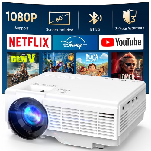 Projector with Screen, Bluetooth 5.2, Support FHD 1080P Portable Projector for TV Stick/Phone/HDMI